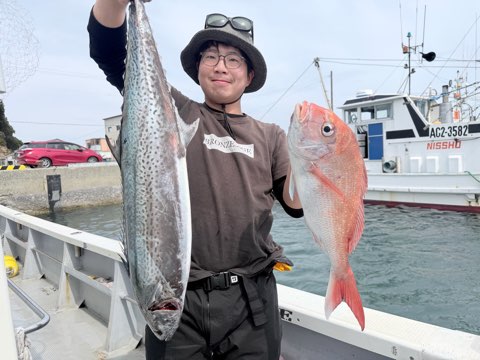 サワラも狙って探し回りましたが、当たれず最後に沢山釣ってたしんぺいマンにお呼ばれしてメーターUPのデカサワラと大きい真鯛もジグでキャッチ✨